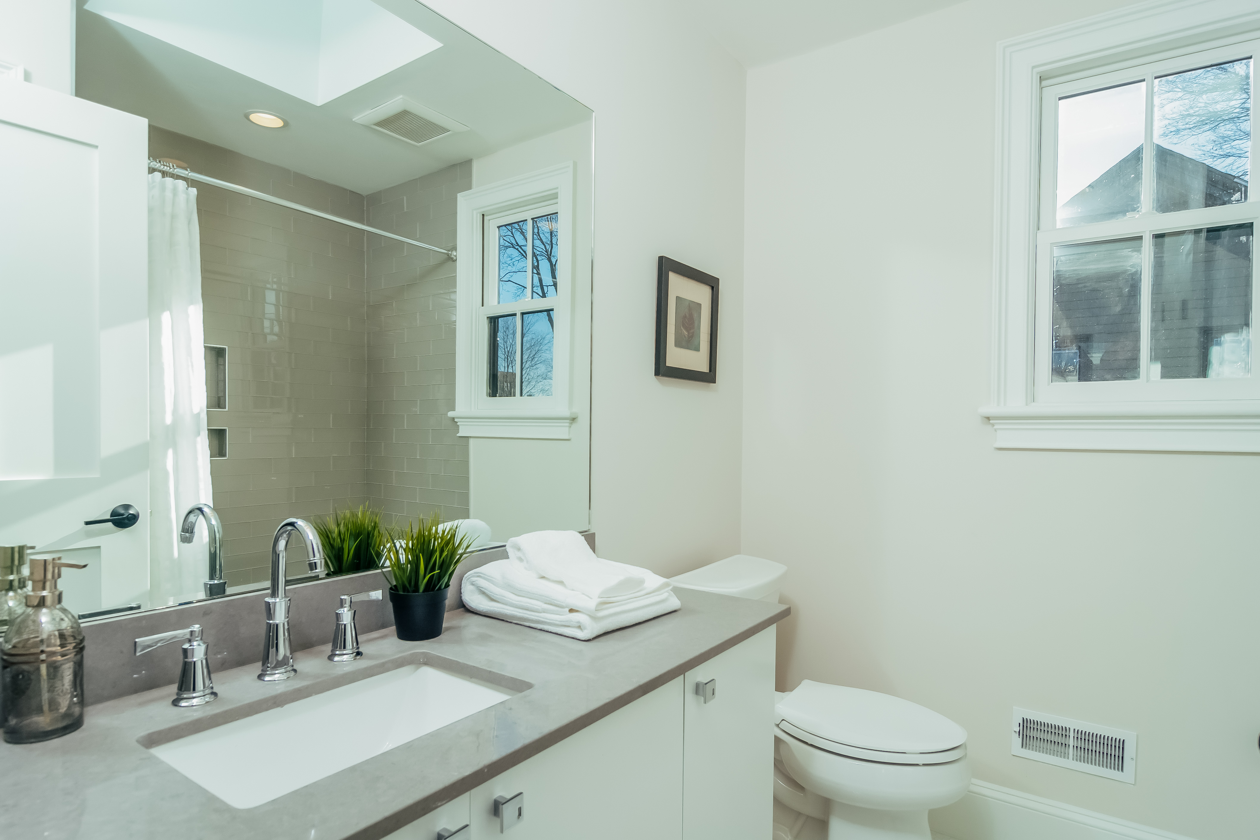 For mechanical systems, we installed a Viessmann 96 efficient boiler, which feeds a 50-gallon superstore hot water tank for endless hot water. The boiler also supports hydronic radiant heating in the basement floor, as well as Trane air handlers for hydro-air heating and air conditioning for the upper floors.
